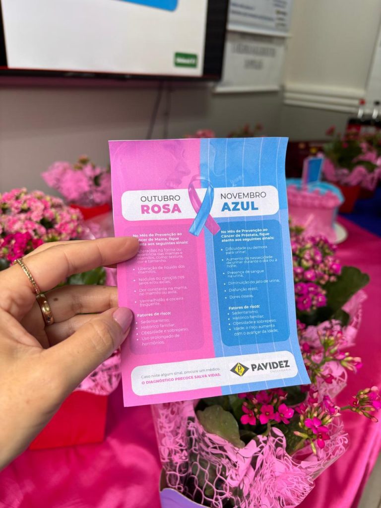 novembro 3, 2025A Pavidez Engenharia finalizou o mês de outubro com uma série de ações especiais em alusão ao Outubro Rosa, movimento mundial de conscientização sobre o câncer de mama, e deu início à campanha do Novembro Azul, voltada à prevenção e ao diagnóstico precoce do câncer de próstata. Com o envolvimento dos colaboradores de diferentes áreas, as atividades promoveram informação, acolhimento e, principalmente, o incentivo ao cuidado com a saúde.